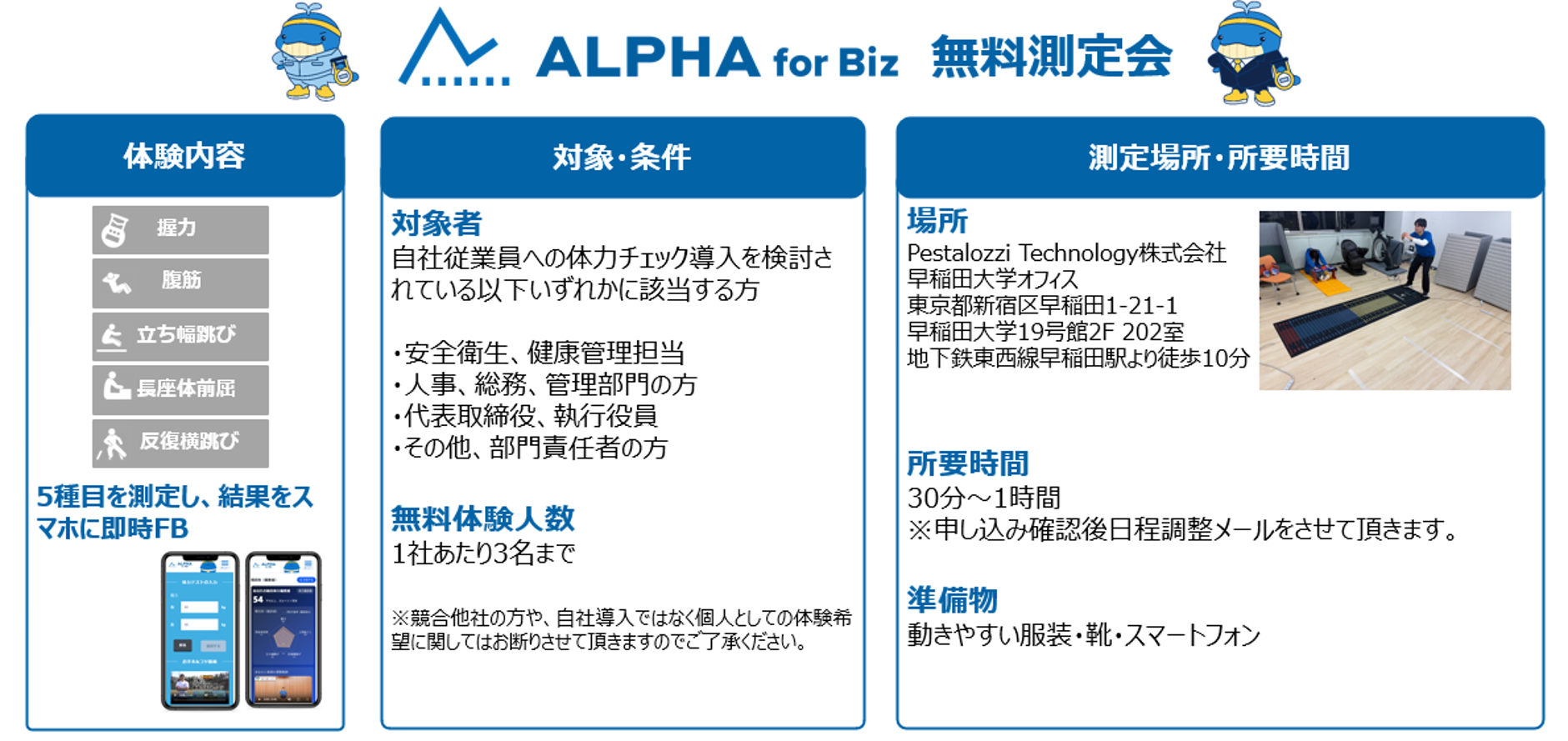 Pestalozzi Technology株式会社(本社:東京都新宿区、代表取締役社長CEO 井上 友綱 以下ペスタロッチという)は、企業向け体力チェックサービスであるALPHA for Bizを、サービス契約前に体験できる「無料測定会」を開始したことをお知らせいたします。ペスタロッチのオフィス(早稲田大学19号館内)に企業の導入検討者がライトに体力チェックができるスペースを設け、体力チェックの測定を実施、結果はWebアプリを通じて即時フィードバックされます。