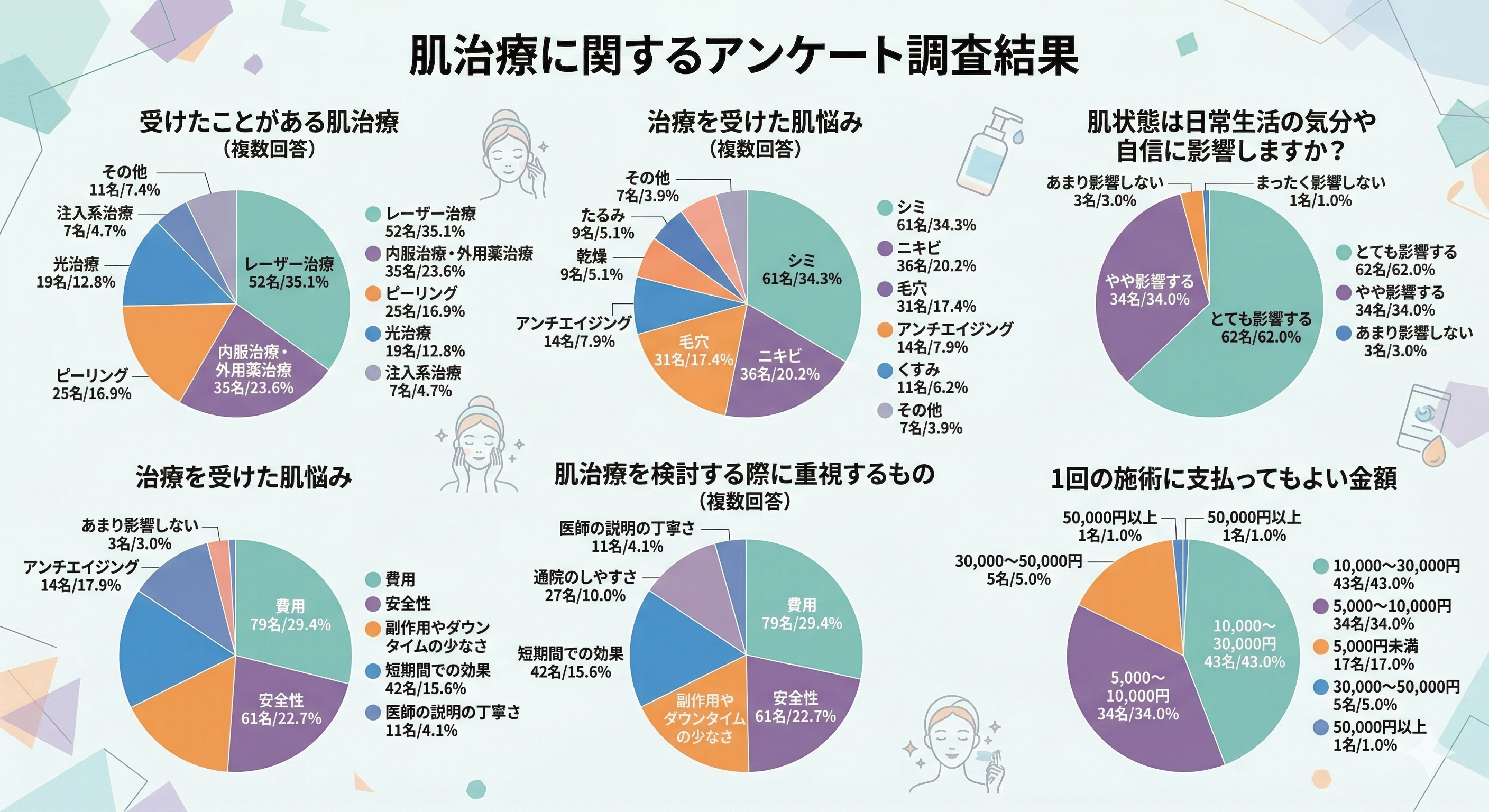 今回の調査から、肌治療は「見た目の改善」だけでなく、「心理的安心」や「日常の質」を支える医療として捉えられている傾向が明らかになりました。