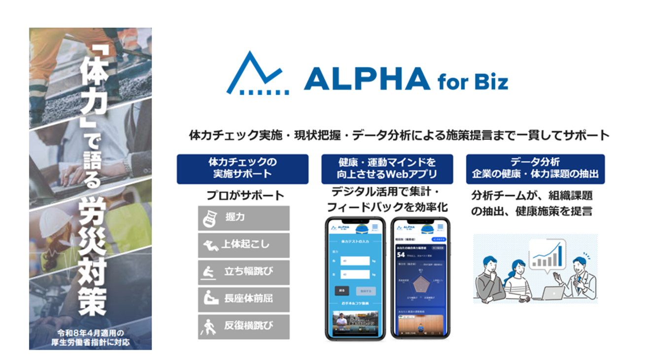 ブースにおいては、労災防止・健康経営の取り組みに活用して頂ける体力チェックサービス「ALPHA for Biz」をご紹介いたします。厚生労働省が令和8年2月10日に公示した指針(同年4月1日適用)において、高年齢者の労働災害防止のため、体力チェックを継続的に行うこと、体力低下が高年齢者に限らないことから若年層から行うことが望ましいと言及されており、人手不足の中で従業員の労災防止・健康投資を検討されている企業様向けに、サービス紹介を行います。