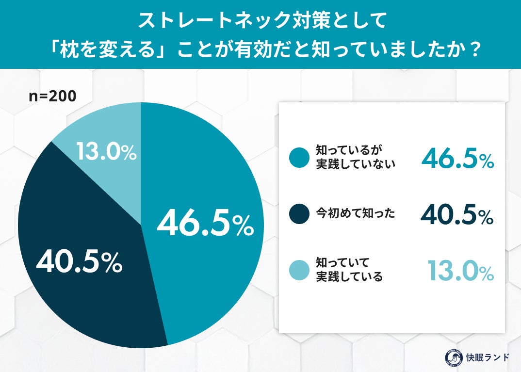• 知識と実践のギャップ: 枕での対策が有効と知っているが「実践できていない」人が46.5%