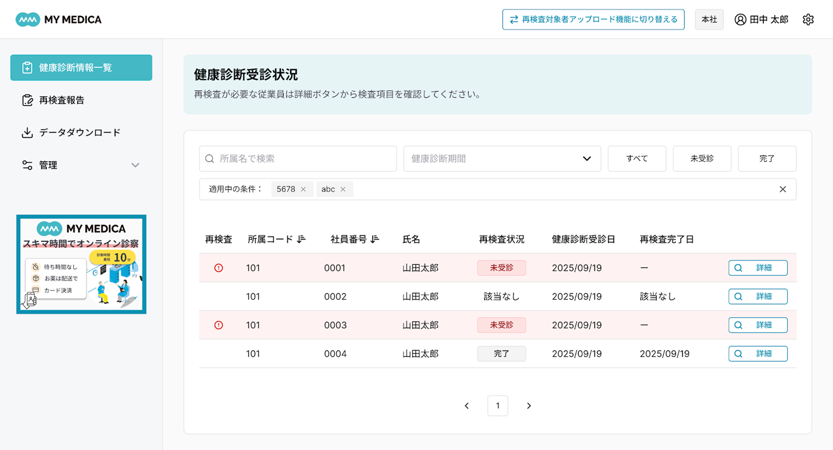 従業員が健康診断結果の血圧・血糖・脂質などの主要項目をアプリに入力するだけで、再検査の要否を自動判定し、再検査対象者がデータ化されます。再検査が必要な場合は、アプリ上でオンライン診療を受けることが可能です。