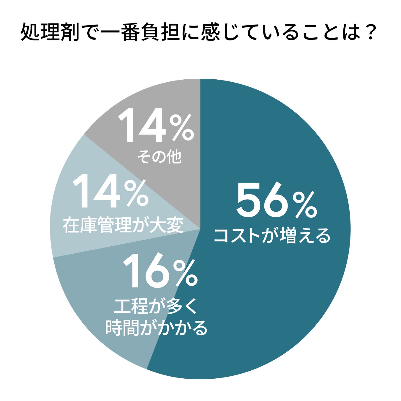 一方で、これら多様なニーズに応えようと処理剤の用途が細分化された結果、美容室の現場の負担が増加しています。当社が実施した調査では、54%の美容師様が「処理剤の使いこなしが難しい」と回答。さらに、別の設問で、具体的な負担について調査したところ、「コストの増加(56%)」や「工程の多さによる時間の圧迫(16%)」が切実な課題として浮き彫りになりました。