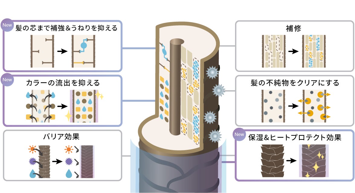 この「お客様の髪の複雑化」と「現場の負担増加」という現場の課題を解決するため、Deeplexは従来の5機能(補修・保湿・疎水化・架橋・キレート効果)に、「熱ケア」「褪色防止」「ダメージうねりケア」を追加し、『8つの多機能トータルケア』へと進化しました。これにより、細分化された処理剤を揃えることによるコスト増を防ぎ、現場での迷いのないシンプルな工程を実現しています。