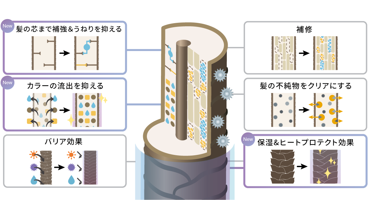 この「お客様の髪の複雑化」と「現場の負担増加」という現場の課題を解決するため、Deeplexは従来の5機能(補修・保湿・疎水化・架橋・キレート効果)に、「熱ケア」「褪色防止」「ダメージうねりケア」を追加し、『8つの多機能トータルケア』へと進化しました。これにより、細分化された処理剤を揃えることによるコスト増を防ぎ、現場での迷いのないシンプルな工程を実現しています。