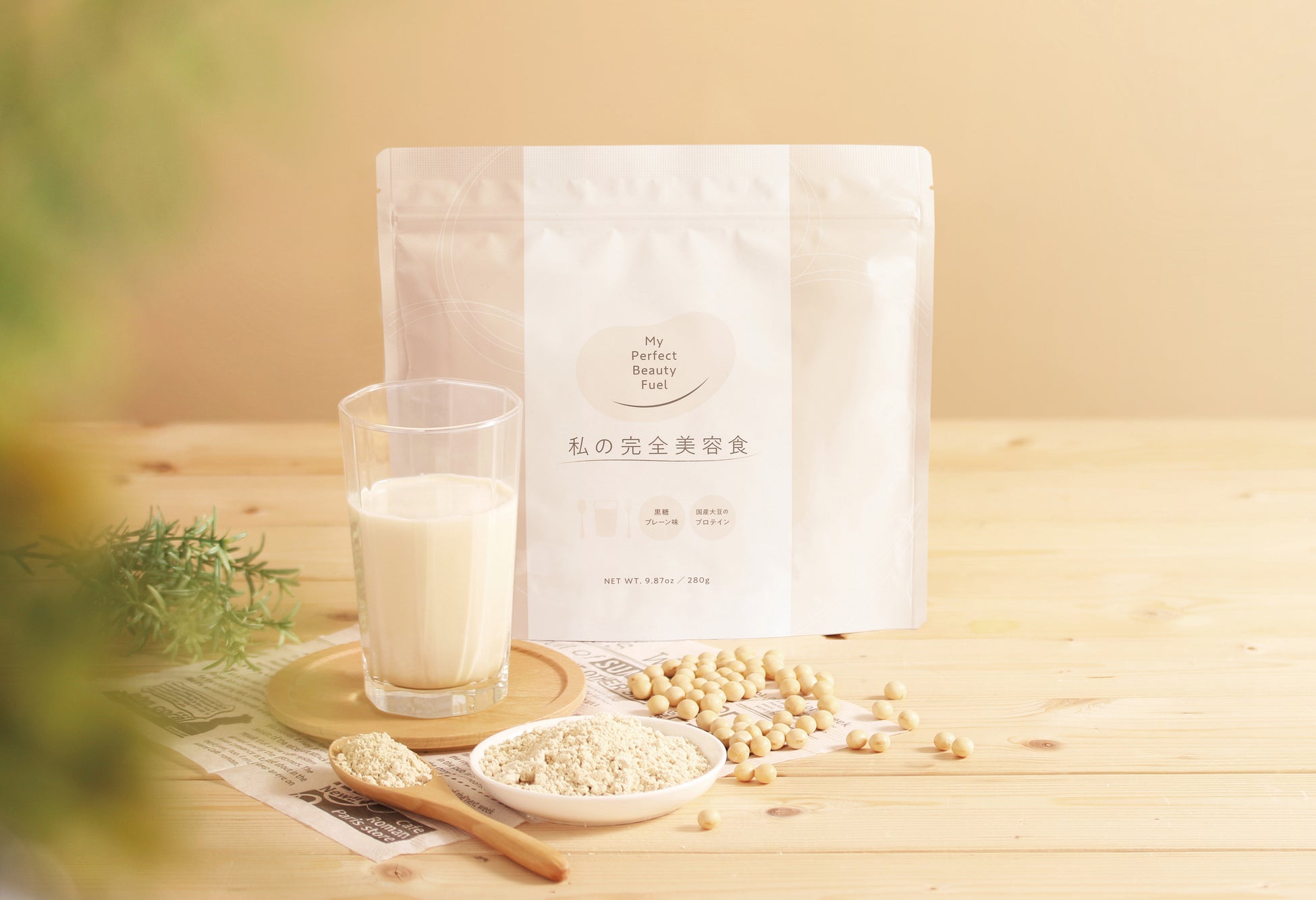 『私の完全美容食』は、非遺伝子組み換え・非ゲノム編集の北海道産大豆や国産素材をまるごと微粉砕したプロテイン。