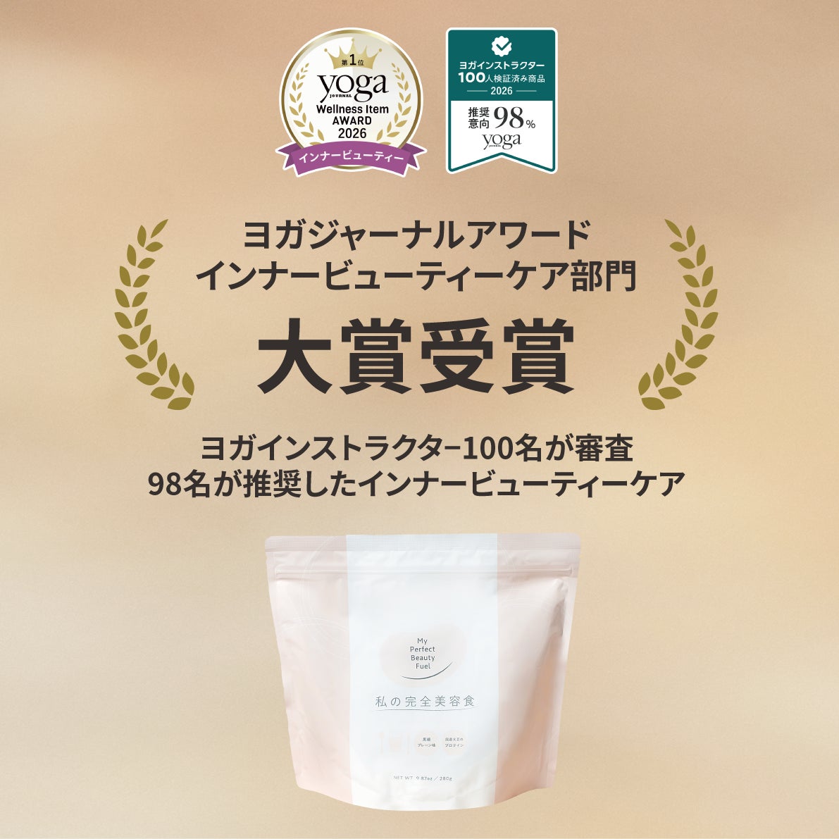 本アワードでは、現役ヨガインストラクター100名を審査員として迎え、多数のインナービューティーケア商品を実際に試用したうえで評価が行われました。その結果、『私の完全美容食』は98名から推奨評価を獲得し、同部門において最高評価となる大賞を受賞しました。