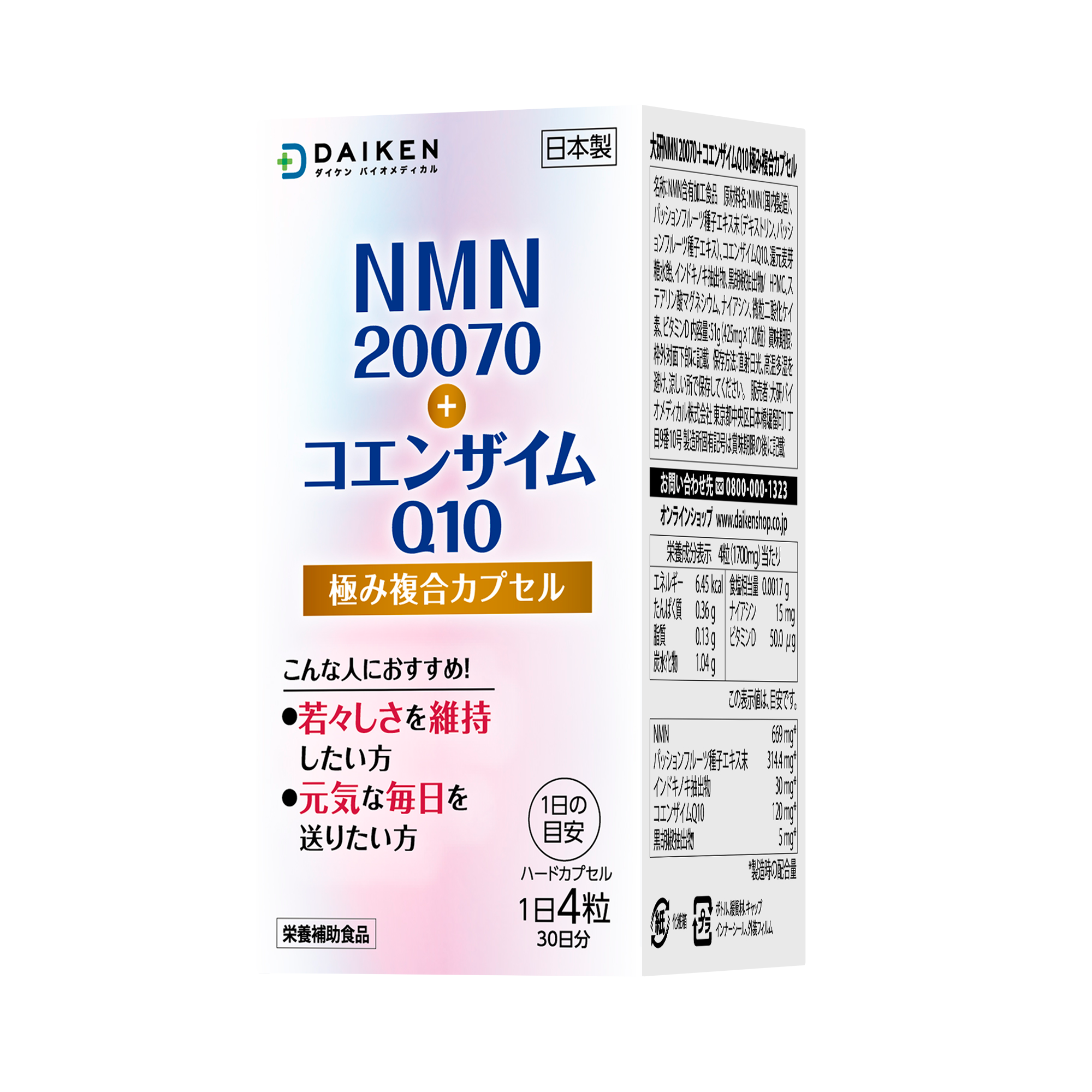 NMN20,070mg配合(NMN669mg/日)+コエンザイムQ10 120mg。ポリフェノール、ビタミンDを組み合わせた多角的な栄養設計