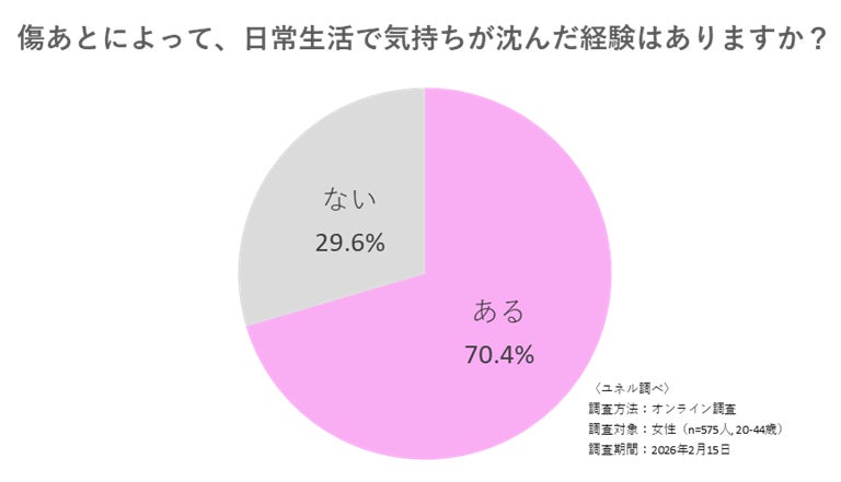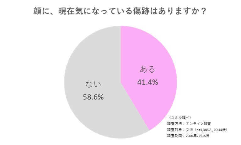 ユネルは2026年2月15日、20〜44歳の女性1,388名を対象に、顔の傷跡に関する実態調査を実施しました。そこから、顔の傷跡が単なる外見の問題を超えて、深刻な心理的・行動的ハードルになっている実態が明らかになりました。