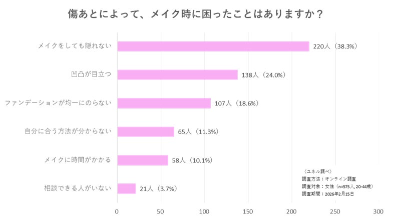 傷跡を持つ女性の55%が「メイク時に困ったことがある」と回答。具体的な悩みとして最多は「メイクをしても隠れない」(38.3%)でしたが、「凹凸が目立つ」(24.0%)、「ファンデーションが均一にのらない」(18.6%)など、凹み特有の悩みが上位を占めています。こうした凹み関連の悩みは合計で全体の約半数を占めており、既存の化粧品では対応が難しいと感じている領域があることが示されました。