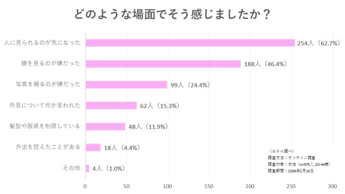 傷跡を持つ女性のうち70.4%が「傷跡によって日常生活で気持ちが沈んだことがある」と回答。具体的な場面を聞くと、「人に見られるのが気になった」(62.7%)、「鏡を見るのが嫌だった」(46.4%)、「写真を撮るのが嫌だった」(24.4%)、「外見について何か言われた」(15.3%)と続き、外見への悩みが行動や自己表現にまで影響している実態が浮かび上がりました。