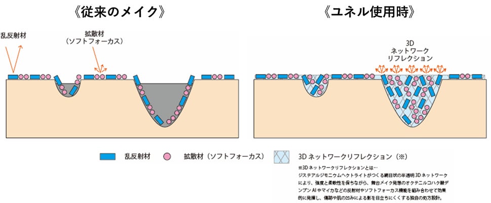 図. 従来のメイクアプローチと、 ユネルの「3Dネットワークリフレクション」構造イメージ