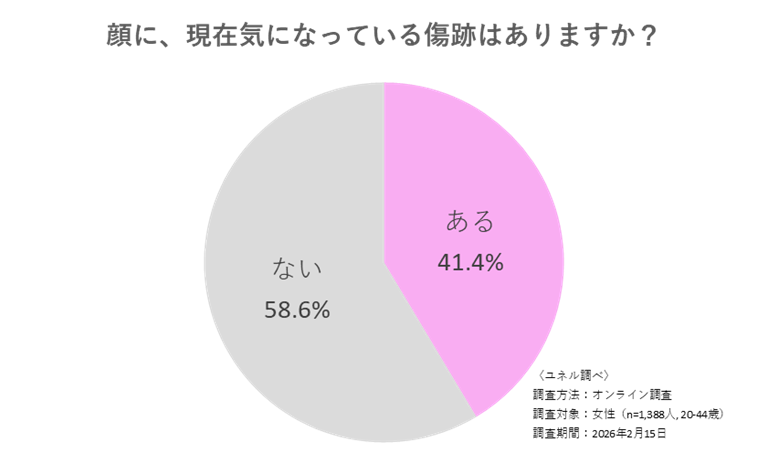 ユネルは2026年2月15日、20〜44歳の女性1,388名を対象に、顔の傷跡に関する実態調査を実施しました。そこから、顔の傷跡が単なる外見の問題を超えて、深刻な心理的・行動的ハードルになっている実態が明らかになりました。