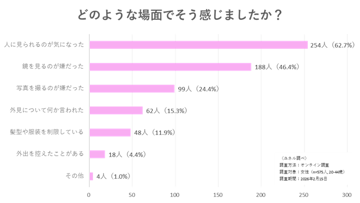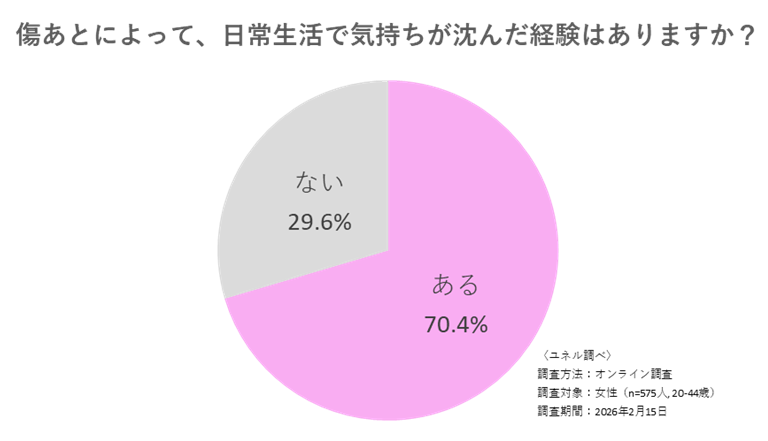 傷跡を持つ女性のうち70.4%が「傷跡によって日常生活で気持ちが沈んだことがある」と回答。具体的な場面を聞くと、「人に見られるのが気になった」(62.7%)、「鏡を見るのが嫌だった」(46.4%)、「写真を撮るのが嫌だった」(24.4%)、「外見について何か言われた」(15.3%)と続き、外見への悩みが行動や自己表現にまで影響している実態が浮かび上がりました。