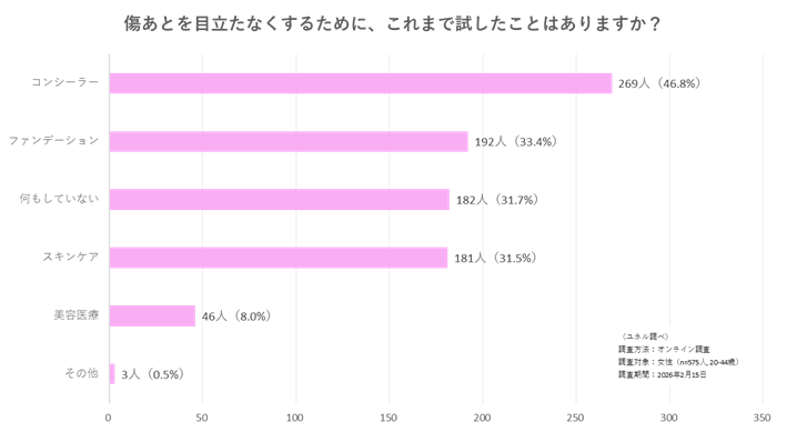 傷跡を目立たなくするために試したことを聞くと、「コンシーラー」(46.8%)が最多であるものの、「何もしていない」(31.7%)という回答が3人に1人にのぼりました。手段を知らない、あるいは試しても効果がなかったために諦めているという実態が浮かびます。