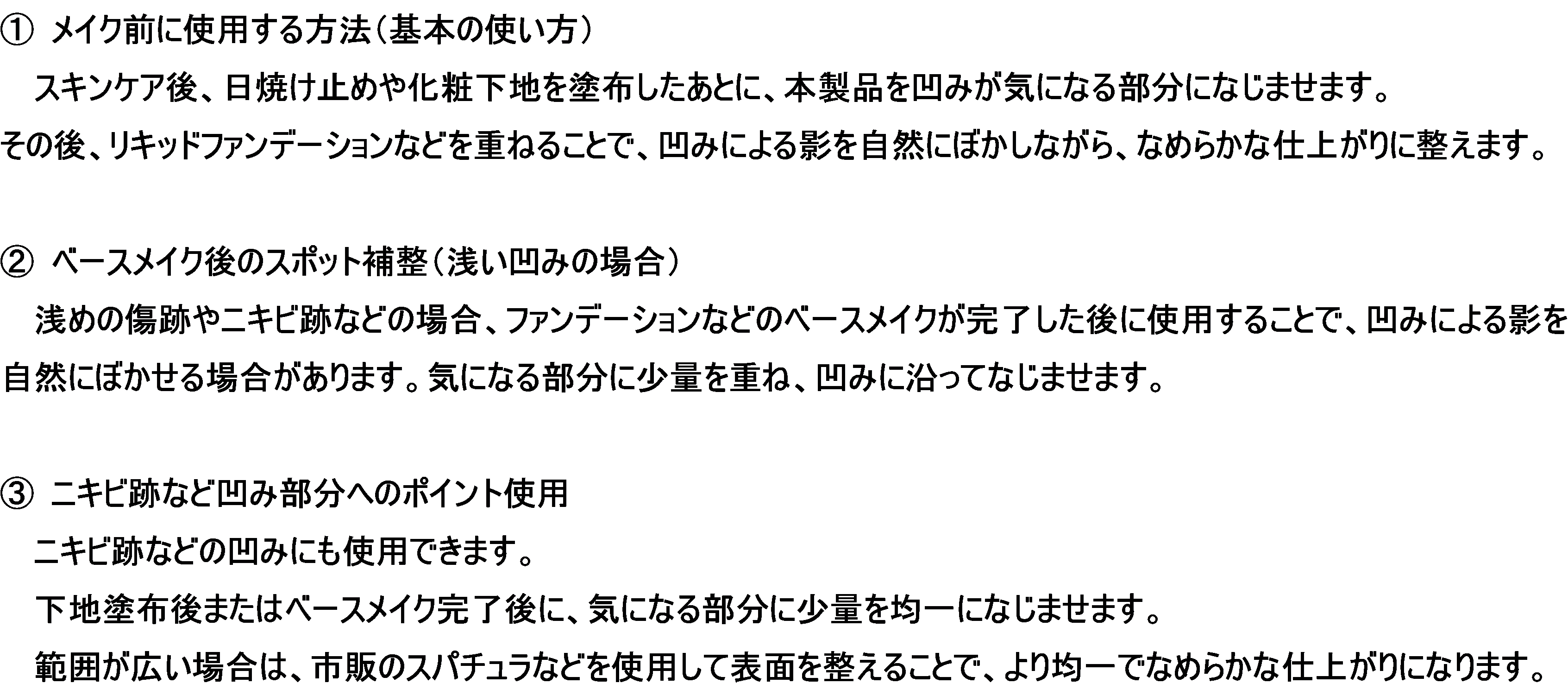 ※2本製品が想定する凹み傷跡とは、怪我や手術痕による浅い凹みや、ニキビ跡などによる肌表面の凹みを指します。盛り上がった傷跡(ケロイド等)や、出血・炎症などのある傷、治癒途中の傷には使用しないでください。