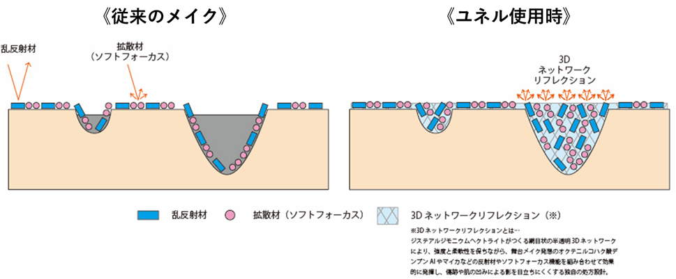 図. 従来のメイクアプローチと、 ユネルの「3Dネットワークリフレクション」構造イメージ