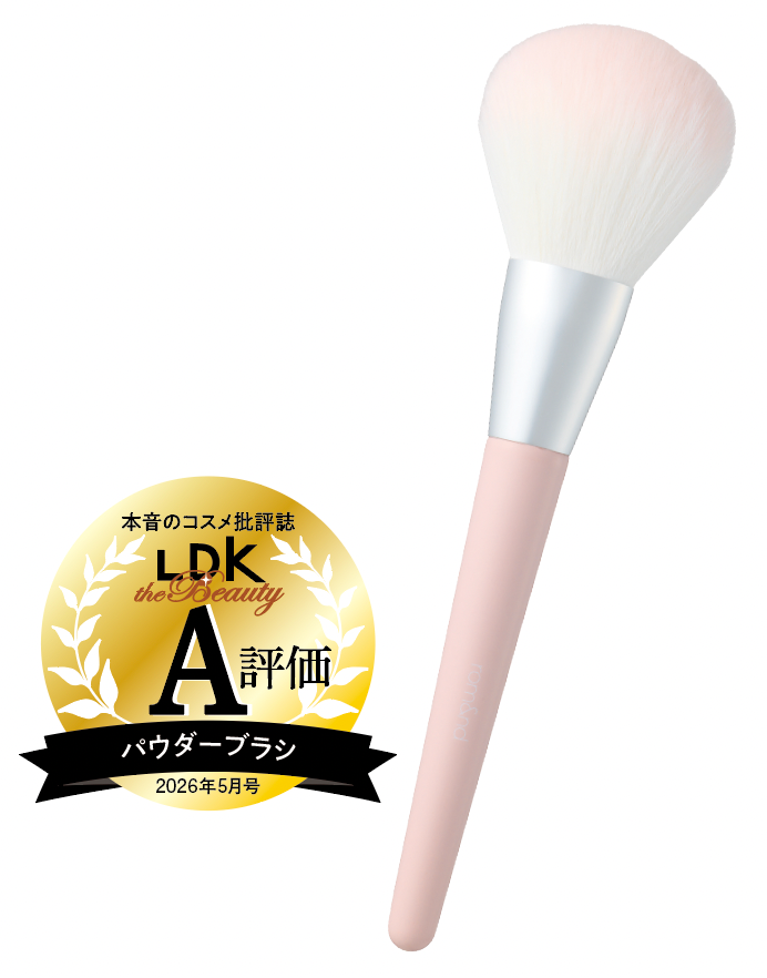 筆の中間から緩い傾斜がついていて、なめらかにしなり、パウダーチークをよりふんわりと仕上げたビッグファンブラシ。頬を包み込むほど大きく広がっているため、自然と均一な薄づきになり、失敗がありません。毛の1本1本が細かくちぢれ、粉含みのよさも文句なし!「肌の上で引っかかることもなく気持ちよく使える!」(モニター)。