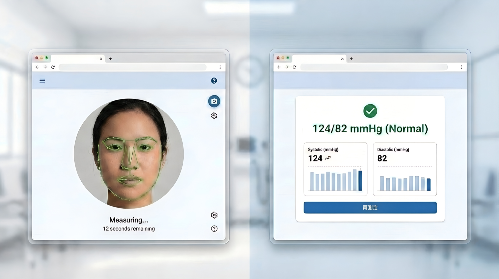 本システムは、特別なセンサーを一切使わず、スマートフォンやPCの標準カメラで顔や皮膚を約15秒間撮影するだけでバイタル情報を可視化します。