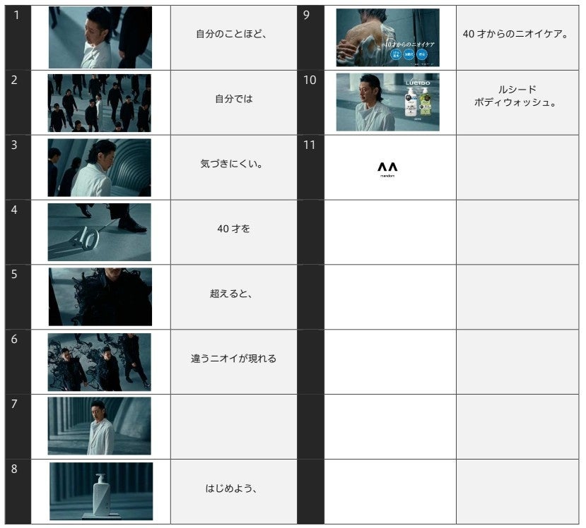 CMの舞台は、荘厳な回廊に佇むオダギリさんのそばを、たくさんの男性たちが歩いてゆく不思議な世界です。真っ白な空間のなか、一定のテンポで歩く人々をじっと見つめるオダギリさん。男性たちが「40」のオブジェが埋め込まれたボーダーラインを踏み越えると、その体から黒いモヤのようなものが現れていることに気がつきます。40才から現れる特有のニオイを表現したこの黒いモヤは、最先端のCG技術を用いて生み出されました。ニオイケアの必要性を伝えながらもルシードらしい上質な世界観を表現するために、美術・衣装・演出にいたるまで、丁寧に作り込んだ映像となっています。