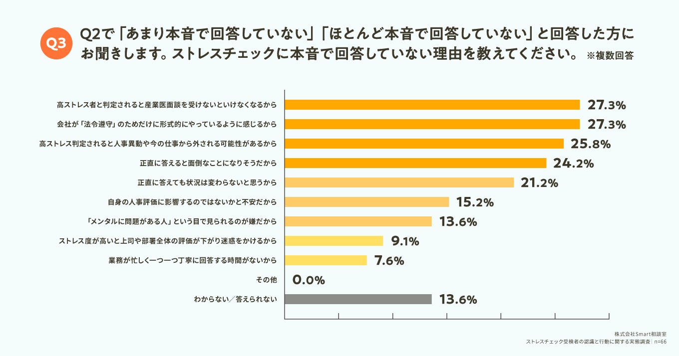 Q2で「あまり本音で回答していない」「ほとんど本音で回答していない」と回答した方に対して、「Q3. ストレスチェックに本音で回答していない理由を教えてください。(複数回答)」(n=66)と質問したところ、「高ストレス者と判定されると産業医面談を受けないといけなくなるから」が27.3%、「会社が「法令遵守」のためだけに形式的にやっているように感じるから」が27.3%、「高ストレス判定されると人事異動や今の仕事から外される可能性があるから」が25.8%という回答となりました。ここから、従業員側が抱く「調査への不信感」や「不利益を被ることへの不安」が、回答を躊躇させる主な要因となっていることが推察されます。