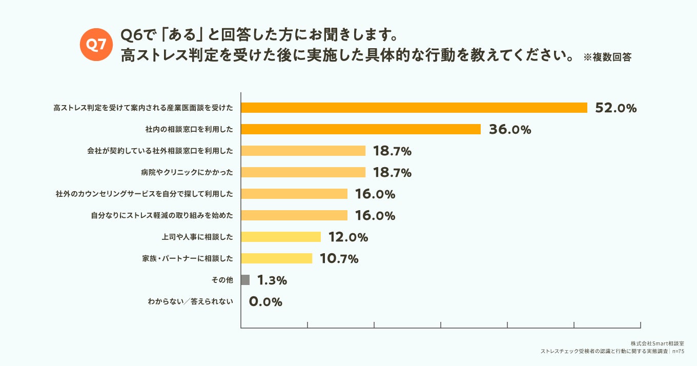 Q6で「ある」と回答した方に対して「Q7. 高ストレス判定を受けた後に実施した具体的な行動を教えてください。(複数回答)」(n=75)と質問したところ、「高ストレス判定を受けて案内される産業医面談を受けた」が52.0%、「社内の相談窓口を利用した」が36.0%という回答となりました。