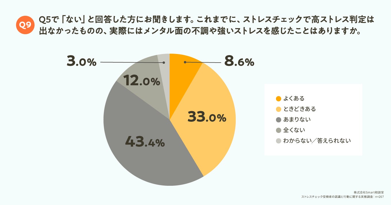 Q5で「ない」と回答した方に対して、「Q9. これまでに、ストレスチェックで高ストレス判定は出なかったものの、実際にはメンタル面の不調や強いストレスを感じたことはありますか。」(n=267)と質問したところ、「よくある」が8.6%、「ときどきある」が33.0%という回答となりました。この結果から、ストレスチェックの判定結果のみを基準としたケアでは不十分であり、全従業員を対象とした包括的なサポート体制の重要性がうかがえます。