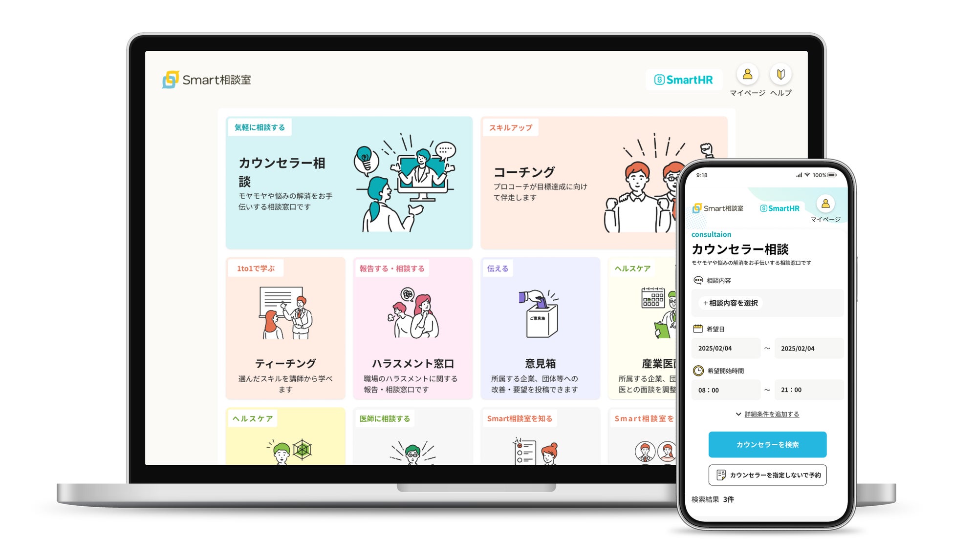 「働く人の『モヤモヤ』を解消し、『個人の成長』と『組織の成長』を一致させる」をミッションに、法人向けオンライン対人支援プラットフォームを開発、運営しています。2021年2月、医療系事業会社で10年間、新規事業開発と組織マネジメントに従事した藤田康男が代表として設立し、メンタル不調の未然防止により企業の健康経営を後押しする社外相談窓口サービス「Smart相談室」と、個人の可能性を最大化し企業の人的資本経営を加速させるコーチングサービス「Smartマイコーチ」を展開しています。Smart相談室はSmartHRのグループ会社です。