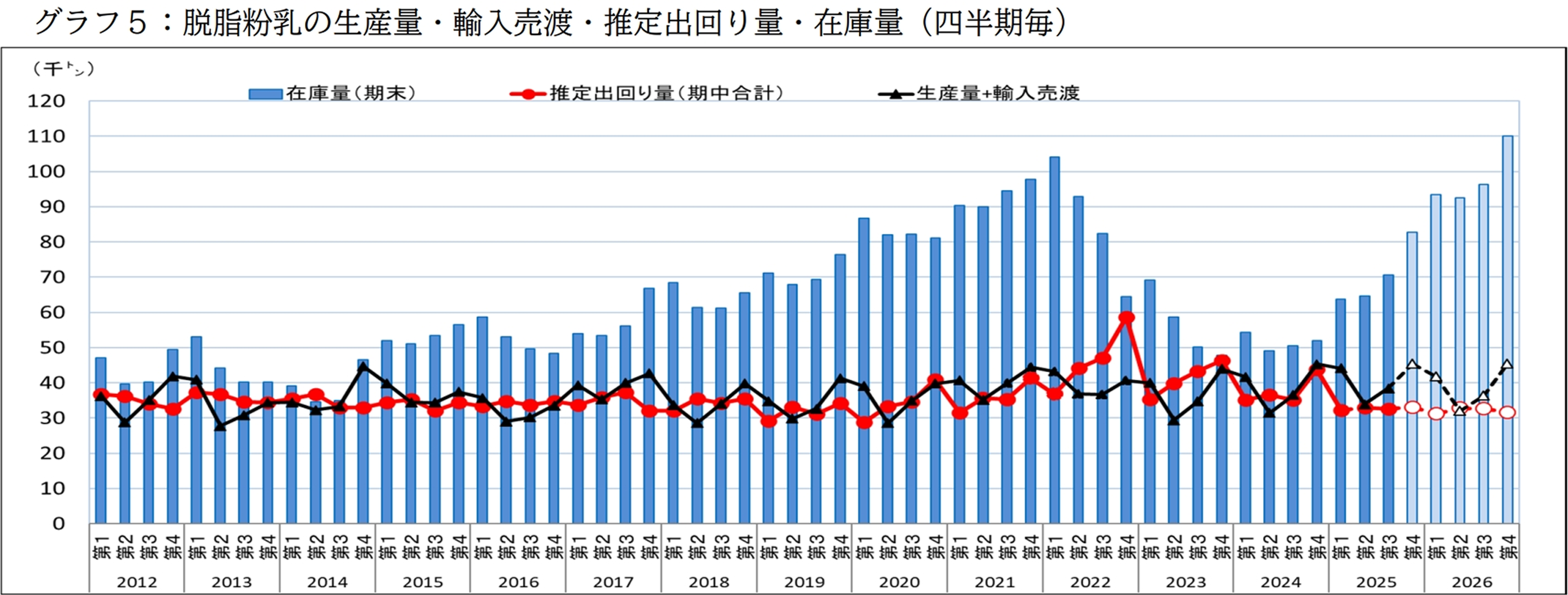 現在、日本の酪農業は複数の構造的課題に直面しています。牛乳は保存が難しい食品であるため、需要を上回る生乳が発生した場合、その一部はバターや脱脂粉乳といった加工品として保存・調整されます。しかし、バターに比べて脱脂粉乳は家庭用途が限られており、需要が伸びにくいという特徴があります。農林水産省の2026年1月公表資料によると、2025年度末(2026年3月末)の脱脂粉乳在庫量は8万2,800トンに達する見通しとされており、乳製品の需給バランスをめぐる課題の一つとなっています。