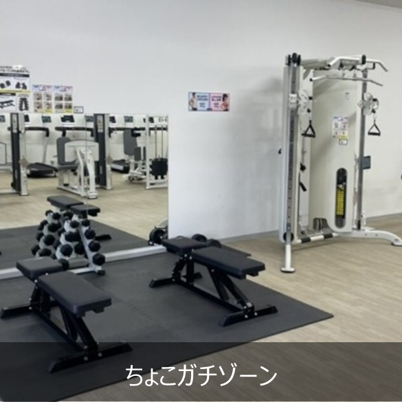 「ダンベルなどのフリーウェイトに興味はあるものの難しそう」、「上級者がいる中には入りづらい」という初心者の心理的ハードルを打破した「ちょこガチゾーン」です。初心者でも抵抗なくご利用いただけるよう「ちょこガチゾーン」と銘打ち、使い方やポイントをchocoZAPアプリで解説するサービスを一部店舗にテスト導入しております。また従来のマシンには物足りなさを感じていた中級者にもご満足いただける設計です。通常のchocoZAPのトレーニングマシンに加えて、ちょこガチゾーンにはダンベル、ベンチ台、ケーブル、マルチプレス、ストレッチ器具などを追加で配備しております。今後は、利用動向を検証し多店舗展開を検討してまいります。