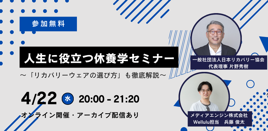 本セミナーでは、医学博士であり休養学研究の第一人者である日本リカバリー協会代表理事の片野秀樹が、科学的な視点からリカバリーウェアの種類や役割を解説します。さらに第2部では、ウェルビーイングメディア「Wellulu」の編集部・兵藤俊太氏を迎え、メディア視点からの質問形式で「リカバリーウェアの正しい選び方」を深掘りします。