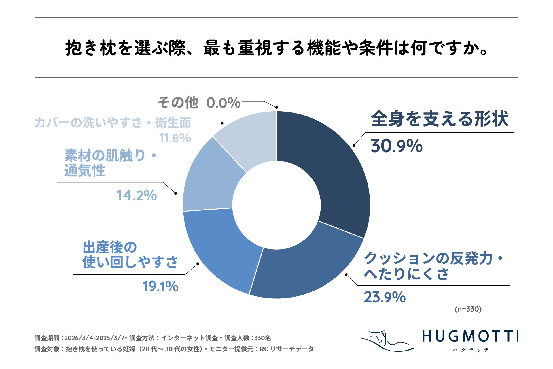調査の最後、「抱き枕を選ぶ際、最も重視する機能や条件は何か」を尋ねる設問への回答では、1位が「全身を支える形状」で30.9%、2位が「クッションの反発力・へたりにくさ」で23.9%、3位が「出産後の使い回しやすさ」で19.1%という結果になりました。この結果から、抱き枕を選ぶ際に最も重視する機能や条件は、「全身を支える形状」であることがわかりました。