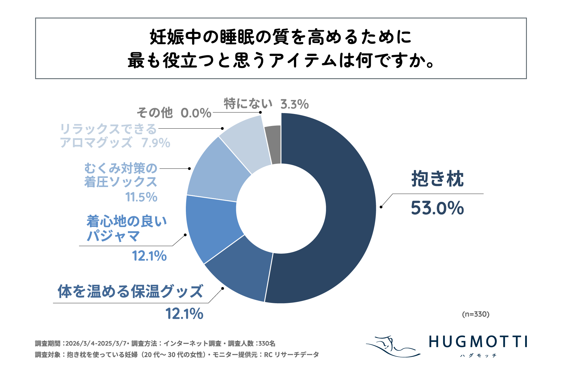 また、「妊娠中の睡眠の質を高めるために最も役立つと思うアイテムは何か」を尋ねる設問への回答では、1位が「抱き枕」で53.0%、2位が同率で「体を温める保温グッズ」と「着心地の良いパジャマ」で12.1%という結果になりました。この結果から、妊娠中の睡眠の質を高めるために最も役立つと考えるアイテムは「抱き枕」であることがわかりました。