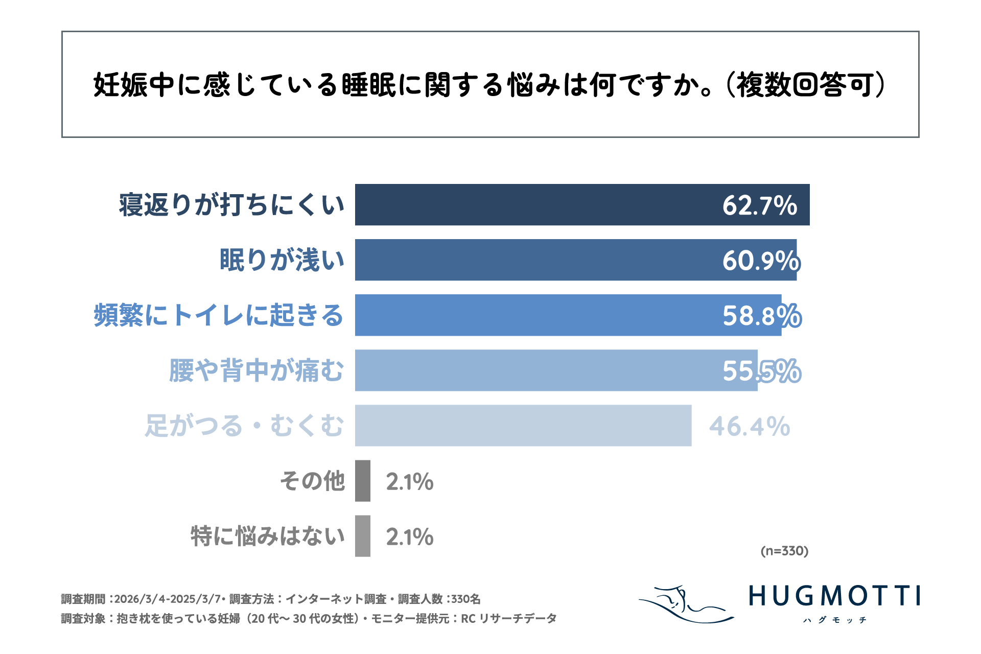 抱き枕「ハグモッチ」を企画・製造・販売する株式会社ラキスプリード(本社:福井県福井市、代表取締役:渡邉 健太)は、抱き枕を使っている妊婦(20代~30代の女性)を対象に「抱き枕を使っている妊婦の睡眠に関する調査」を実施しました。この調査から、抱き枕を使っている妊婦の睡眠に関する悩みや寝姿勢の課題、睡眠の質を高めるための工夫などが明らかになりました。