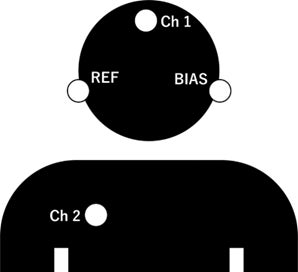 計測電極を前頭部と右鎖骨に設置し, 参照電極と接地電極を左右の耳の乳様突起に設置します。