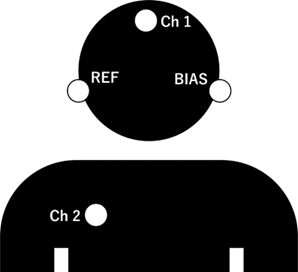 計測電極を前頭部と右鎖骨に設置し, 参照電極と接地電極を左右の耳の乳様突起に設置します。
