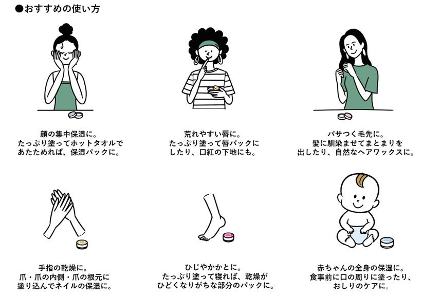 体温ですっと溶けて少量でも伸びがよいため、心地よくお使いいただけます。かさついた顔、唇、髪の毛先、手肌、爪、ひじ、かかとなど、乾燥が気になる部分を集中ケアします。