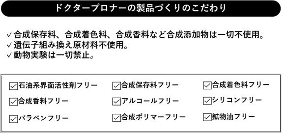 ドクターブロナーは、1948年の創業以来、全ての製品がオーガニックであることに、こだわりを持ち続けています。成分のほとんどが無農薬有機栽培で育てられた植物で、独自の厳しいガイドラインを定めたフェアトレードプロジェクトを通じて調達しています。私たちの肌にはもちろん、地球にも環境にもやさしい製品づくりをしています。