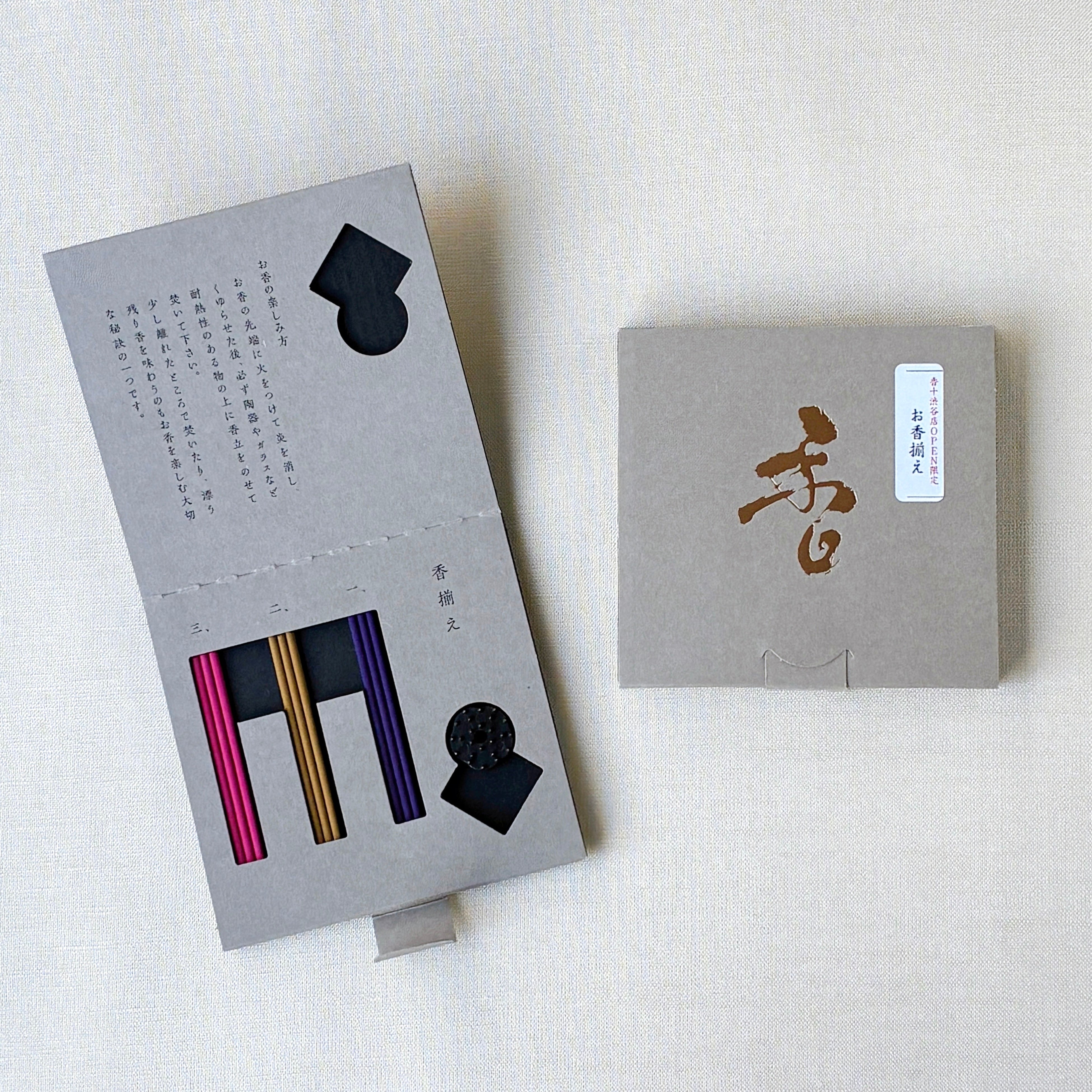 またオープン記念として、税込1,100円以上お買い上げのお客様に、おひとり様につき1点、3種類のお香と香立てがセットになった「お香揃え」をプレゼントします。