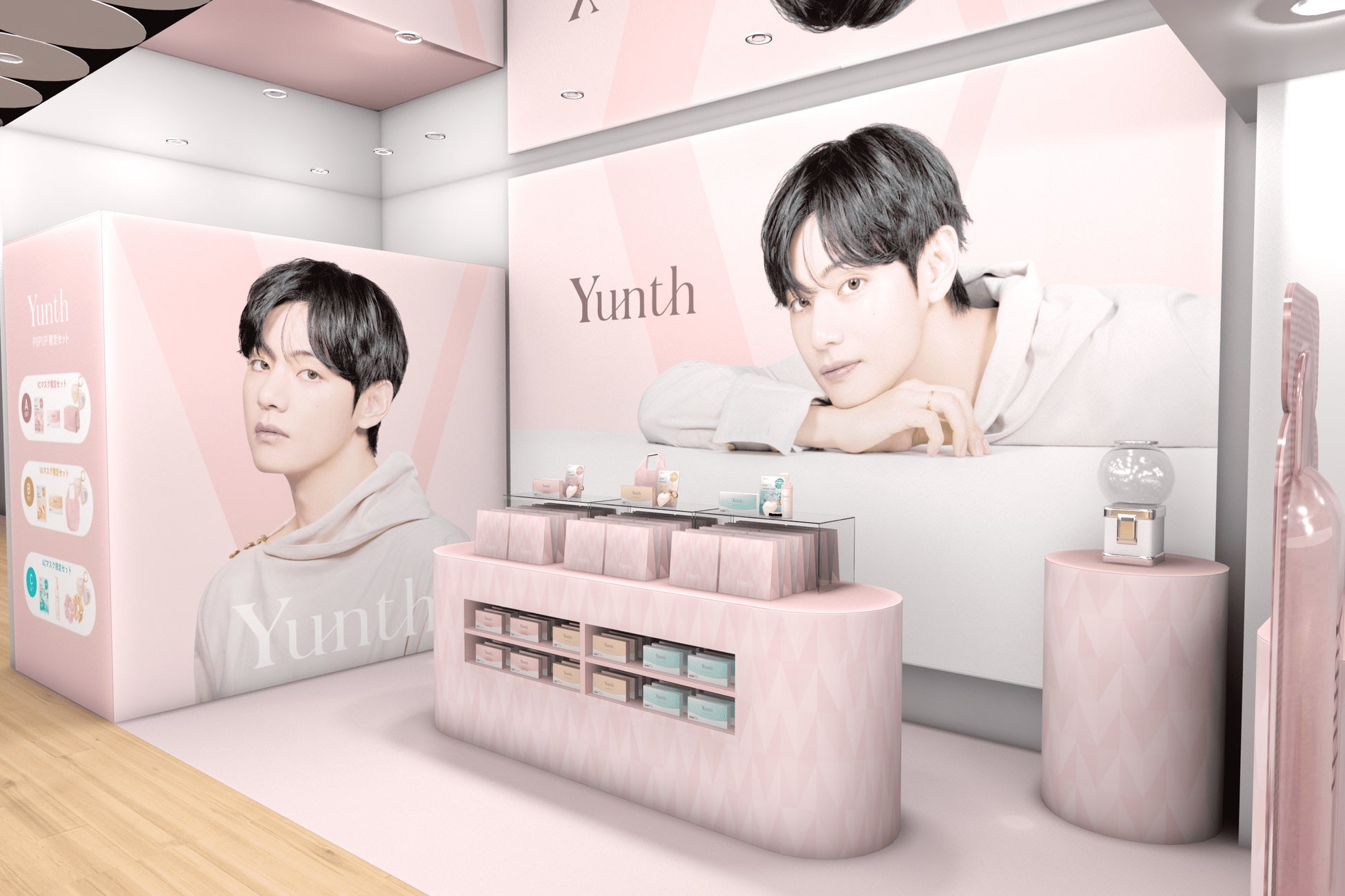 Yunthのテーマカラーであるピンクを基調とした特別な空間に、ブランドアンバサダーであるBTS・Vさんのビジュアルを掲出。ブランドの世界観を体感いただけます。 会場では、Yunthの人気商品と新商品、さらにオリジナルノベルティを組み合わせたポップアップ限定セットの販売や、予約来場者限定の特典など、この期間だけの特別なコンテンツをご用意。