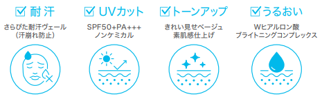 耐汗:メイク作用による / 毛穴:乾燥やキメの乱れによる /くすみ:乾燥によるキメの乱れ /トーンアップ:メイクアップ効果による /汗のにおいからもカバー:香料によるマスキング