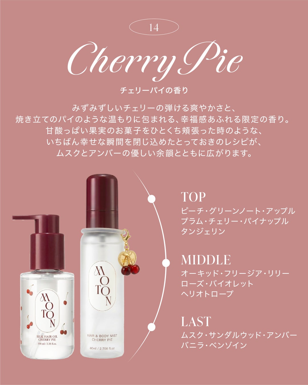 大人気の「ヘア&ボディミスト」と「シルクヘアオイル」から、甘酸っぱさと温かさを纏う、プレミアム香料を使用したチェリーパイの香りが数量限定で新登場。