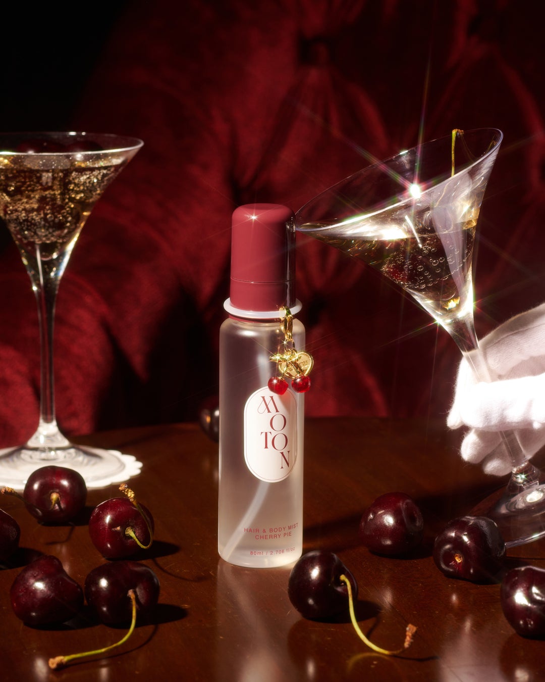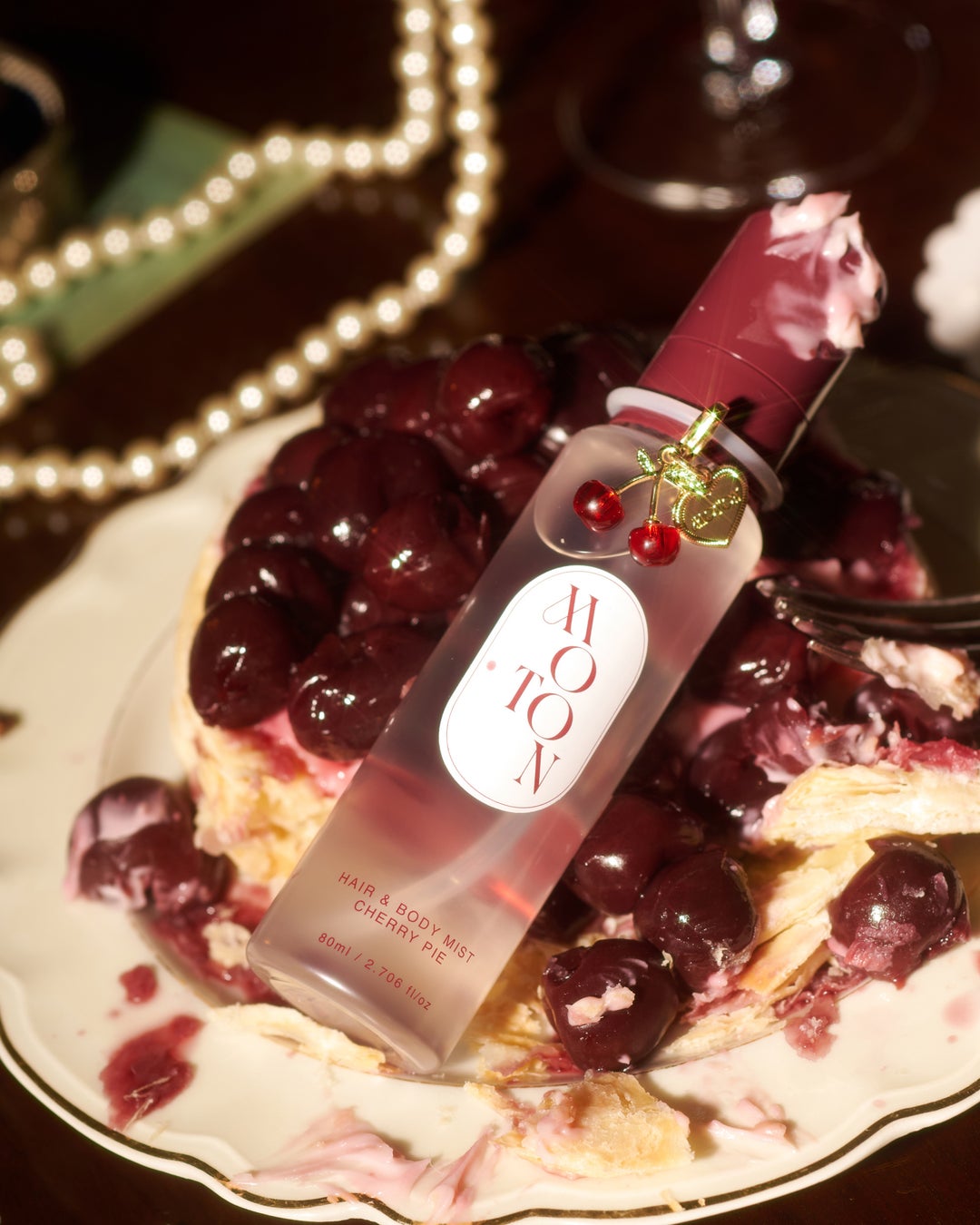 チェリーパイの世界観をぎゅっと閉じ込めた、限定のヘア&ボディミスト。香水のように上品で長時間香りが続き髪にも体にも使える処方で美容成分も配合。毎日にさりげないときめきを添えます。