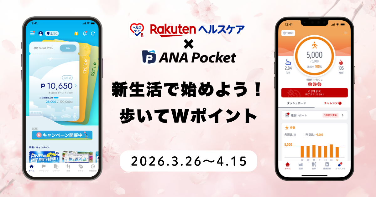 ANA X株式会社(本社:東京都中央区、代表取締役社長:神田 真也、以下「ANA X」 )が提供するスマートフォンアプリ「ANA Pocket(エイエヌエーポケット)」と、楽天グループ株式会社(本社:東京都世田谷区、代表取締役会長兼社長 :三木谷浩史、以下「楽天」)が提供するスマートフォンアプリ「楽天ヘルスケア」は、条件を満たしたユーザーへ特典ポイントを進呈するコラボレーション企画 「新生活で始めよう! 歩いてWポイント」を、2026年3月26日から4月15日まで開催します。