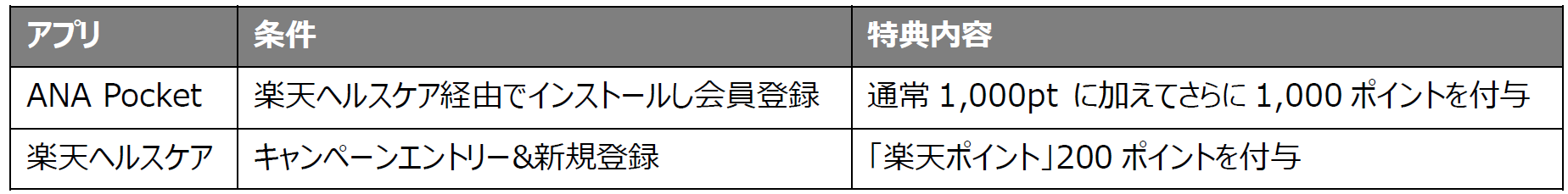 「ANA Pocket」または「楽天ヘルスケア」経由で、いずれかのアプリを初めてインストールして会員登録した場合、下記の通りのボーナス特典を付与します。