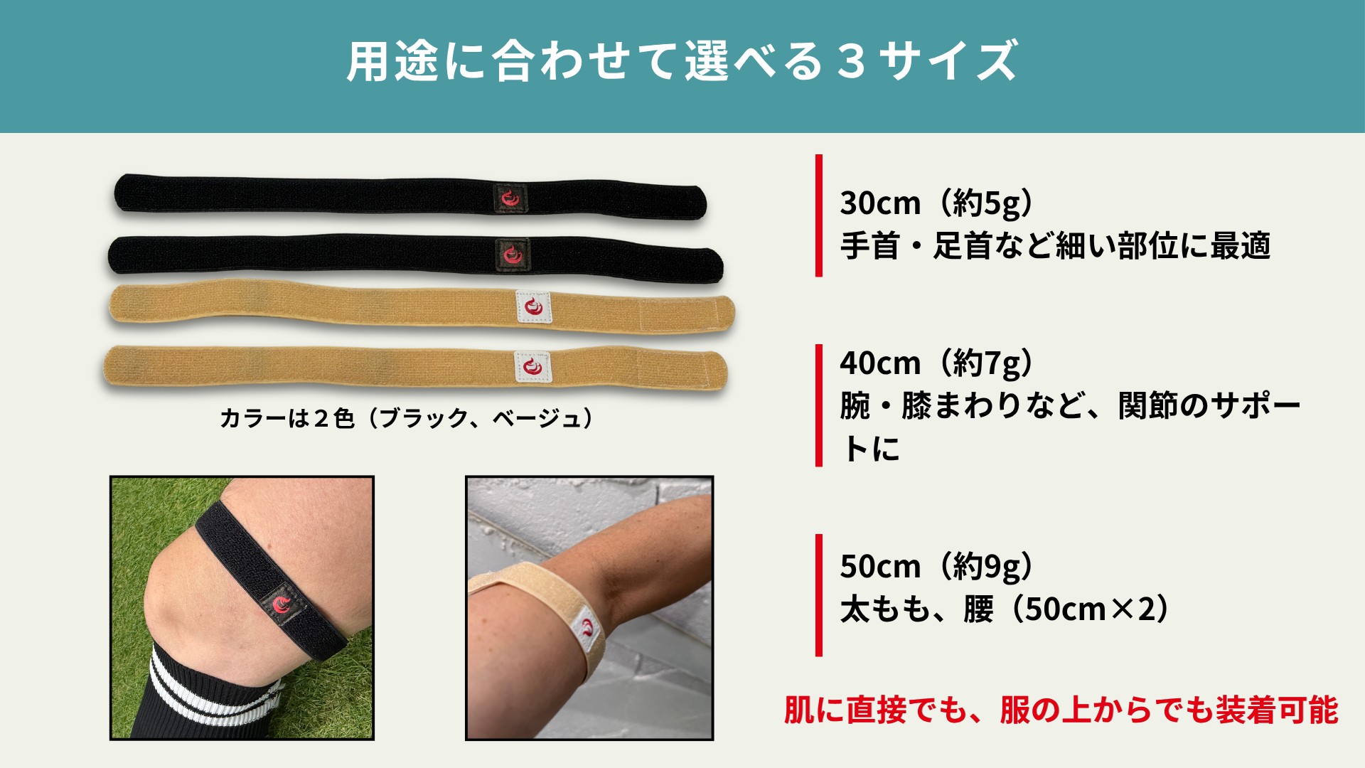 幅20mmのスリム設計: 厚さも最大3mmと極薄。 膝や肘などの関節付近に巻いても、動作を妨げません。