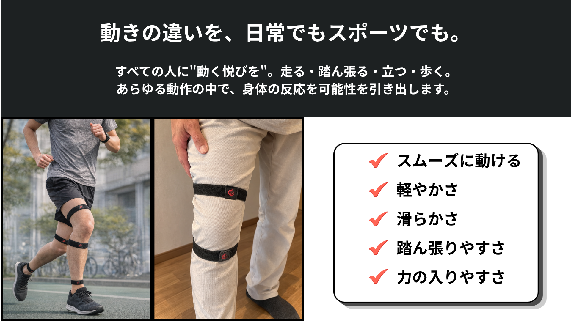 アスリートがプレーに没頭し、シニアの方が安定感を持って歩き出し、日常の笑顔が増える。