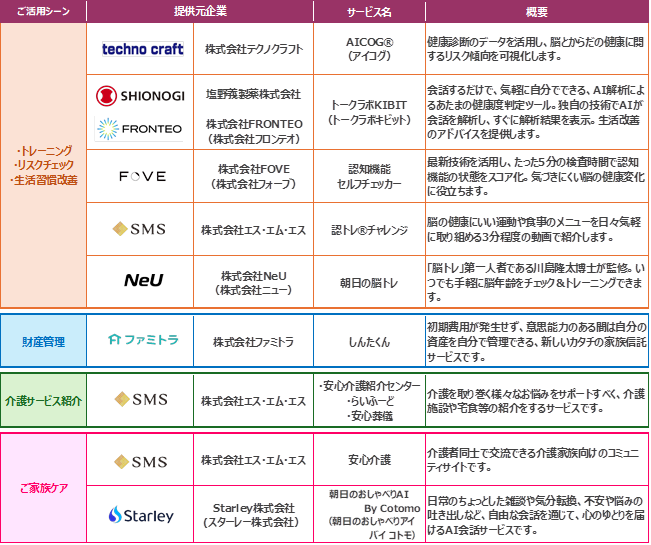 上記参画企業・サービスラインナップを本プロジェクトにおける「第一歩として」位置づけ、今後、参画企業やサービス領域のさらなる拡充を図ることで、介護・認知症領域における社会課題の解決に、より一層貢献してまいります。