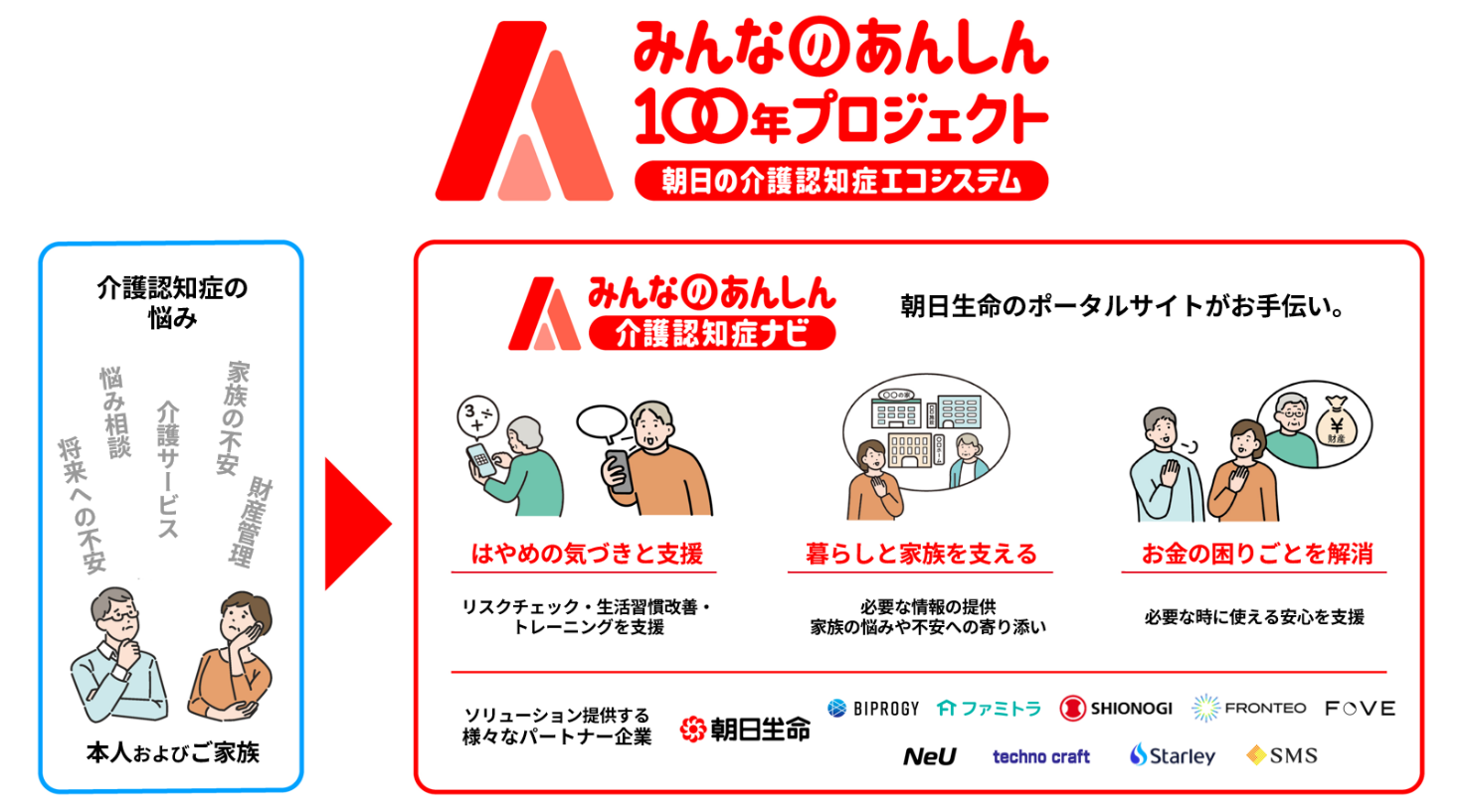 朝日生命保険相互会社(社長︓石島健一郎、以下「当社」)は、2026年4月より、介護・認知症領域における深刻な社会課題の解決に向けた新プロジェクト「みんなのあんしん100年プロジェクト~朝日の介護認知症エコシステム~」を開始いたします。 本プロジェクトでは、介護保険の普及による金銭的な保障にとどまらず、介護・認知症領域のあらゆる局面でお役に立つサービスを外部企業と協力してお客様に提供するエコシステムを構築します。