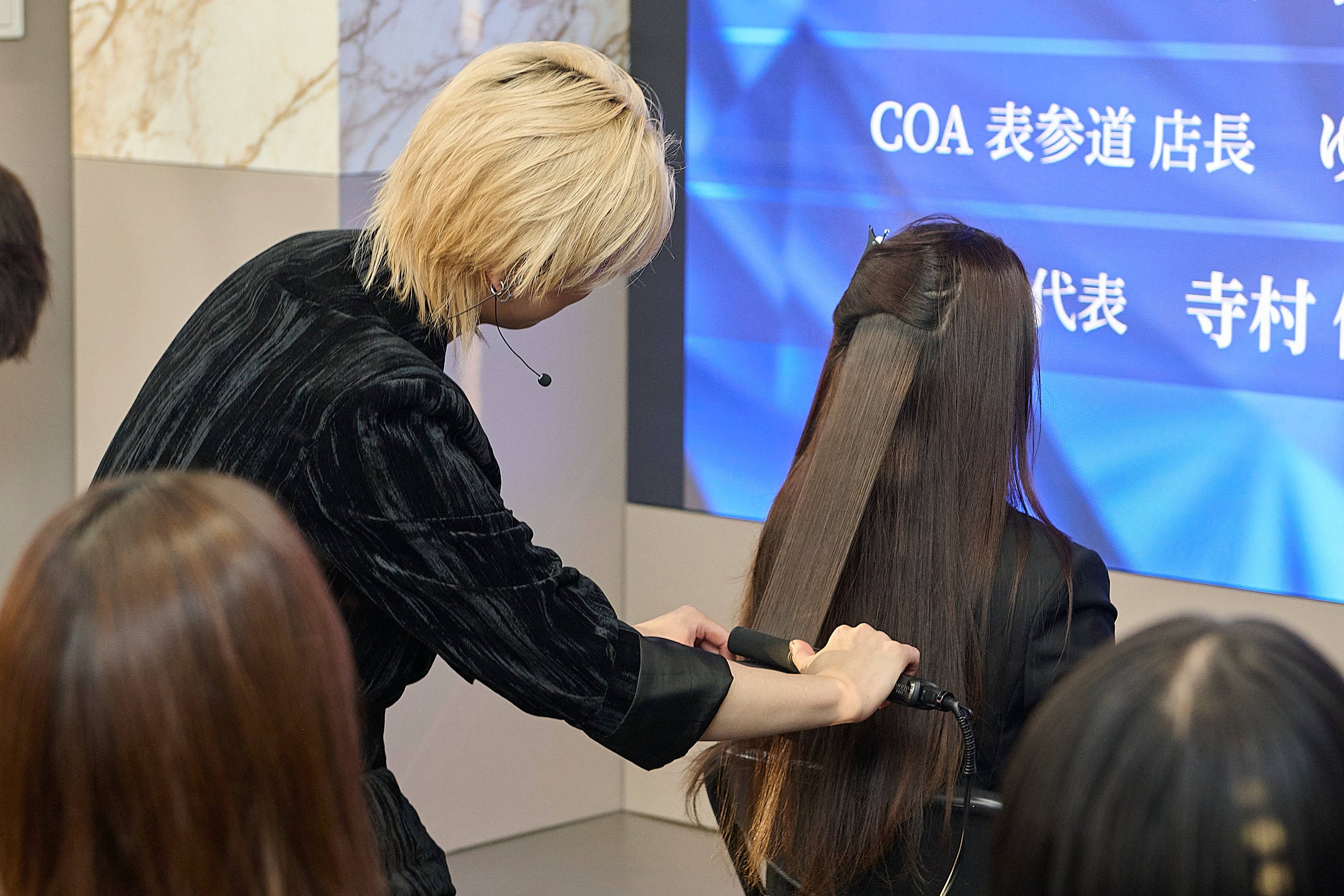 デモンストレーションでは、COA表参道店長 ゆうだい氏が実際に施術を行いながら、「操作性」「熱の入り方」「仕上がり・ツヤ」の違いを伝えました。