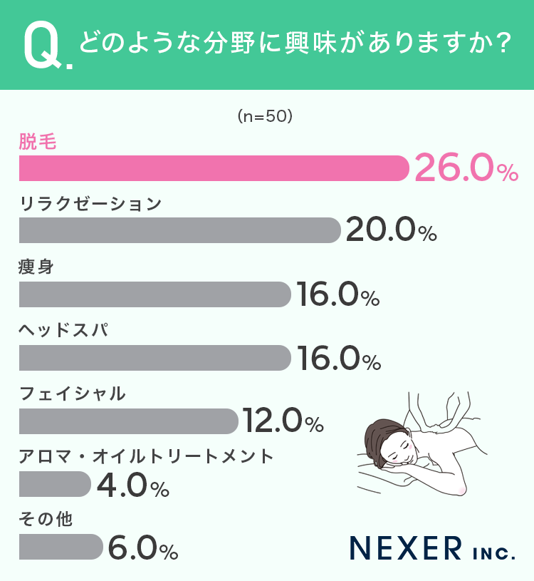 次いで「リラクゼーション」が20.0%、「痩身」と「ヘッドスパ」がそれぞれ16.0%、「フェイシャル」が12.0%という結果になりました。